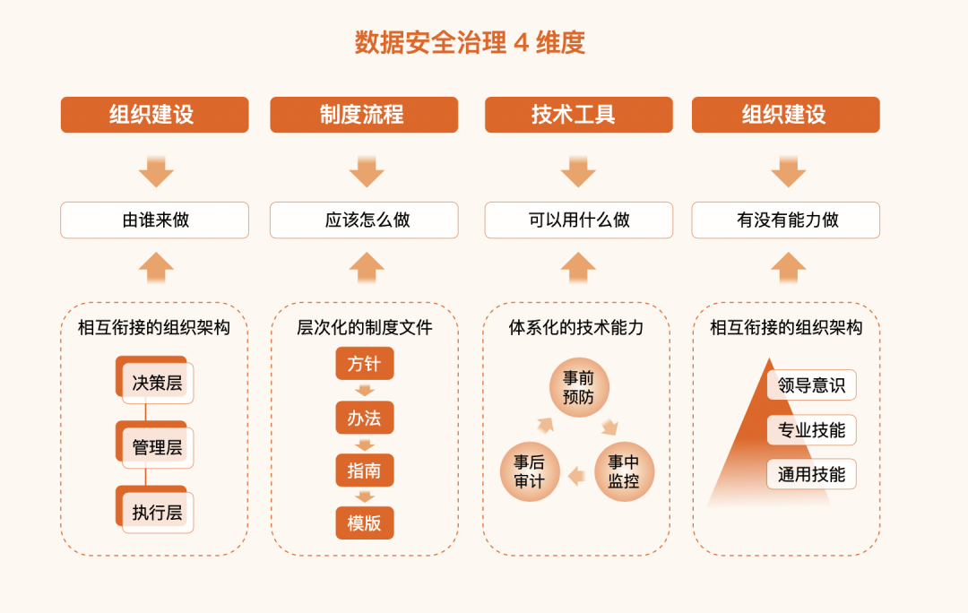 从安全治理的建设围绕的4个维度来看,人员能力本身就是治理建设的一个维度,而组织建设、制度流程与技术工具3个维度,想要实际落地并发挥出实际效果,归根结底还是需要依靠安全团队人员能力。